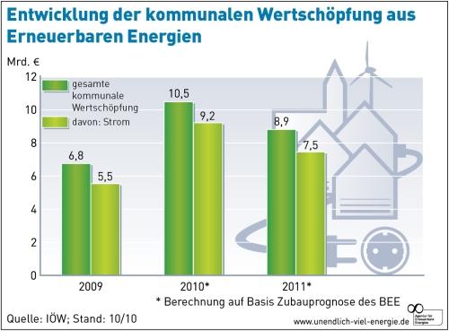 Berlin, 15. Oktober 2010. Der dezentrale Ausbau Erneuerbarer Energien sorgt für steigende Beschäftigung, Einkommen und Steuereinnahmen für die kommunalen Kassen. Auf 8,9 Milliarden Euro beziffert das Institut für ökologische Wirtschaftsforschung (IÖW) diese Wertschöpfungseffekte für das kommende Jahr. Dazu steuern Ökostrom-Kraftwerke rund 7,5 Milliarden Euro bei, Anlagen zur Wärme- und Kraftstofferzeugung jeweils rund 740 Millionen Euro. Im Auftrag der Agentur für Erneuerbare Energien haben die Forscher untersucht, wie hoch die kommunale Wertschöpfung durch Erneuerbare Energien in Deutschland in den Jahren 2009 bis 2011 ausfällt.