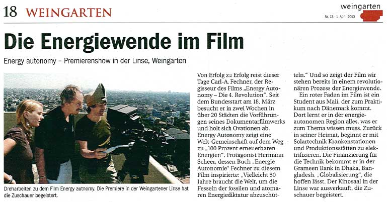 Von Erfolg zu Erfolg reist dieser Tage Carl-A. Fechner, der Regisseur des Films „ENERGY AUTONOMY – Die 4. Revolution“. Seit dem Bundesstart am 18. März besucht er in 14 Tagen in über 20 Städten die Vorführungen seines überaus gelungenen Dokumentarfilmwerks und holt sich Ovationen ab. Am Dienstag im Weingartener Kino Linse stand neben ihm Irja Martens, seine „Executive Producerin“ im Mittelpunkt des Interesses.