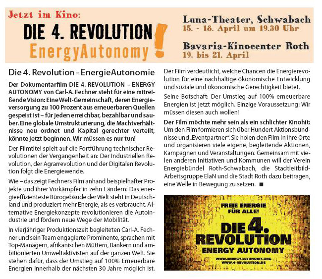 EnergyAutonomy läuft in Schwabach vom 15. – 18.04.2010 - Filmstart am Montag, 19. April 2010 im “Bavaria KinoCenter” in Roth